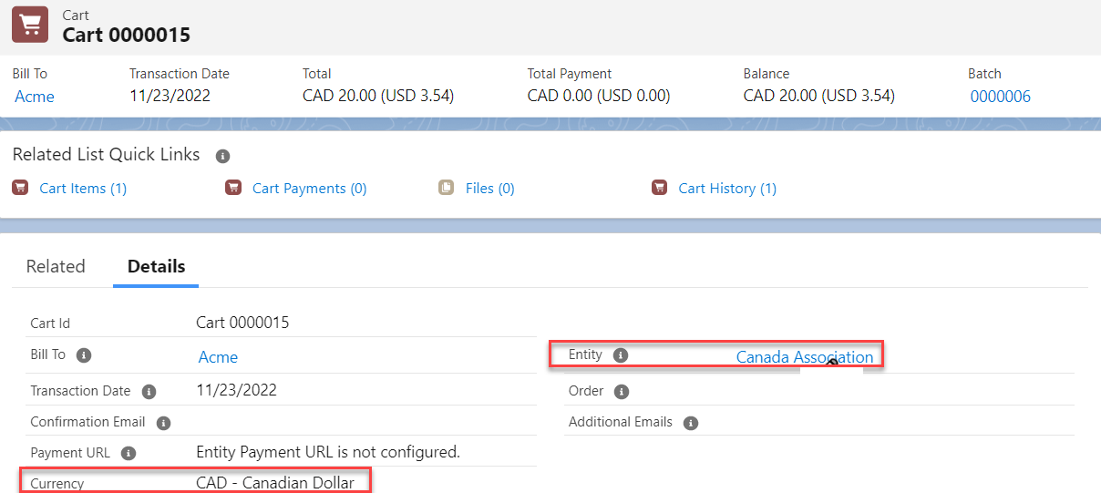 While a new Cart, Cart Item, Cart Item Line, Cart Payment and Cart Payment Lines get created, the Currency field value on these records get populated based on the Currency field value of the Entity that these records are linked with.