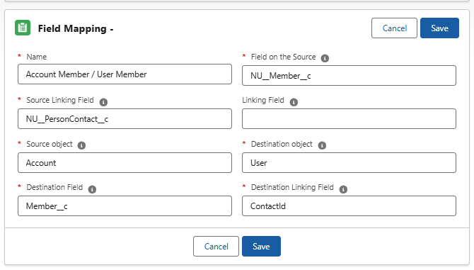 Field Example Value Description NameAccount Member / User MemberWe recommend naming it with the following format (if it doesn't fit, use the field labels or abbreviate words): [Record Source][Source Field] / [Destination Source] [Destination Field]Field on the SourceNU__Member__cThe full API Name of the account field to sync with. Source Linking FieldNU__PersonContact__cThe lookup field on the source object (Account) that relates to the destination object (User). For User-Account syncing, always use: NU__PersonContact__c Source ObjectAccountFor User-Account syncing, always use: AccountDestination ObjectUserFor User-Account syncing, always use: UserDestination FieldMember__cThe full API Name of the user field you created. Destination Linking FieldContactIdThe lookup field on the destination object (User) that relates to the source object (Account). For User-Account syncing, always use: ContactId