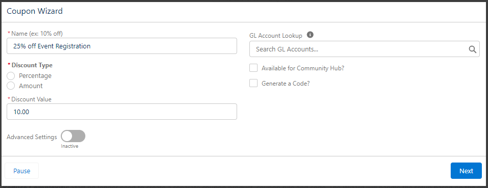 The Coupon Wizard is an easy-to-use tool designed to provide Association Staff with a quick method of creating and configuring coupons. This reduces the time needed for setting up coupon products.