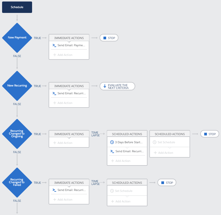 | Schedule - Send Constituent Email | When a payment schedule is created, send the constituent a summary email. When a recurring schedule is created, fails, or processes, send the constituent an email. Specifically, this sends the following email templates when the following criteria are met (and the evaluation happens in this order):