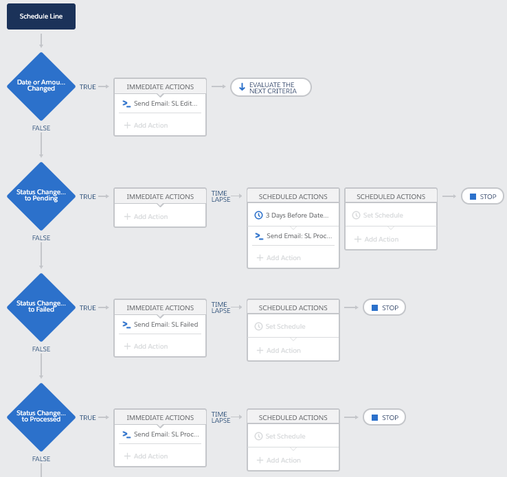 Schedule Line - Send Constituent Emails | When a schedule line fails, processes, is updated, or is processing soon, send the constituent an email. This only affects one-time and installment payments because recurring orders with a saved payment don't use schedule lines. Specifically, this sends the following email templates when the following criteria are met (and the evaluation happens in this order):