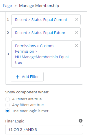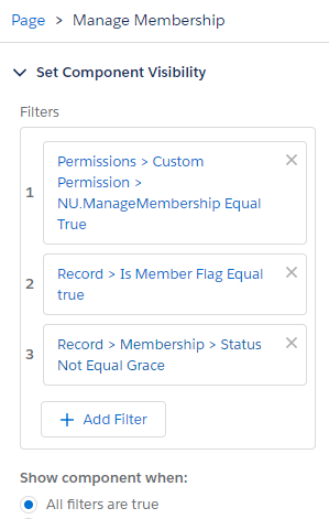 Now you can set the visibility filter for this LWC. Adding the visibility filter is important to ensure the LWC is visible only when certain conditions are met. We recommend adding the visibility filter to ensure the LWC does not display in the membership’s grace period or re-instate period, and displays only when the user has a current or future membership.