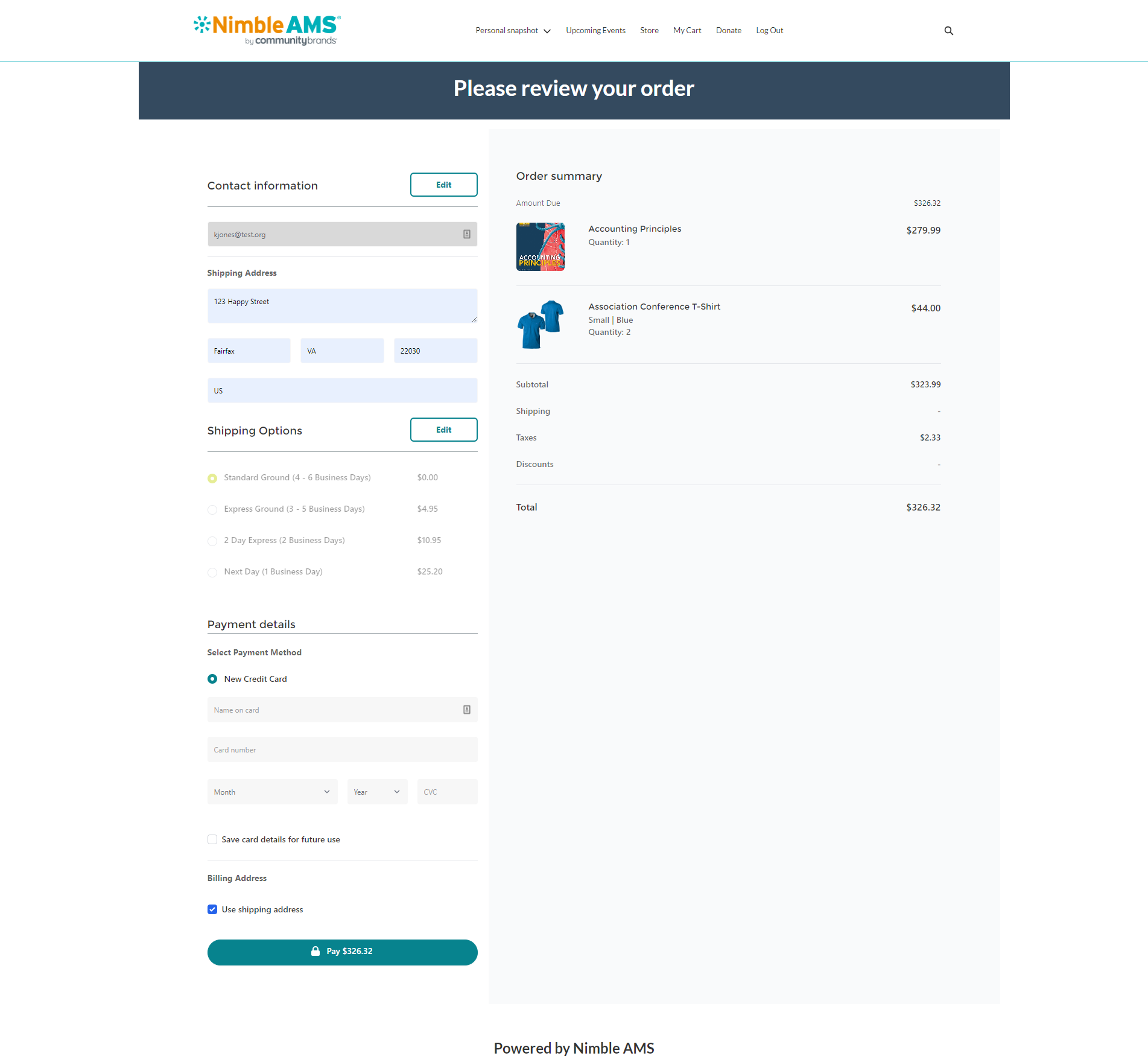 Once a constituent clicks on the URL, it opens the Checkout page in the Member Portal Community Hub where the order with an outstanding balance is displayed. They can review the order, select the shipping option, and pay for the order through the payment options available.