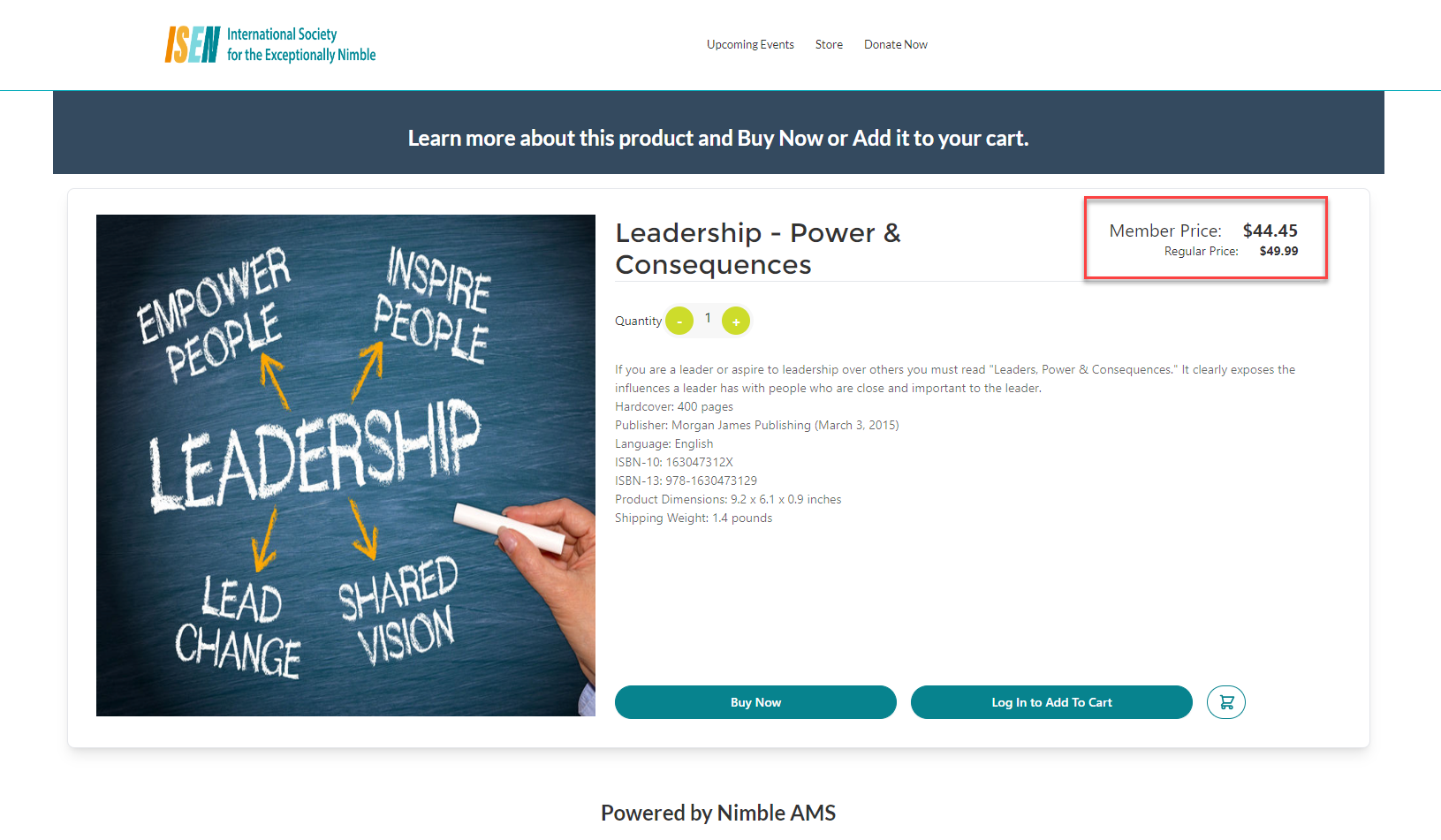 When a guest user views the details of a product, in addition to the regular list price they will also see a Member price. This allows them to see the potential price difference between the two prices and get insight into the savings they will get by being a member. By surfacing and highlighting this important member benefit, associations have an effective tool to increase their membership revenue.