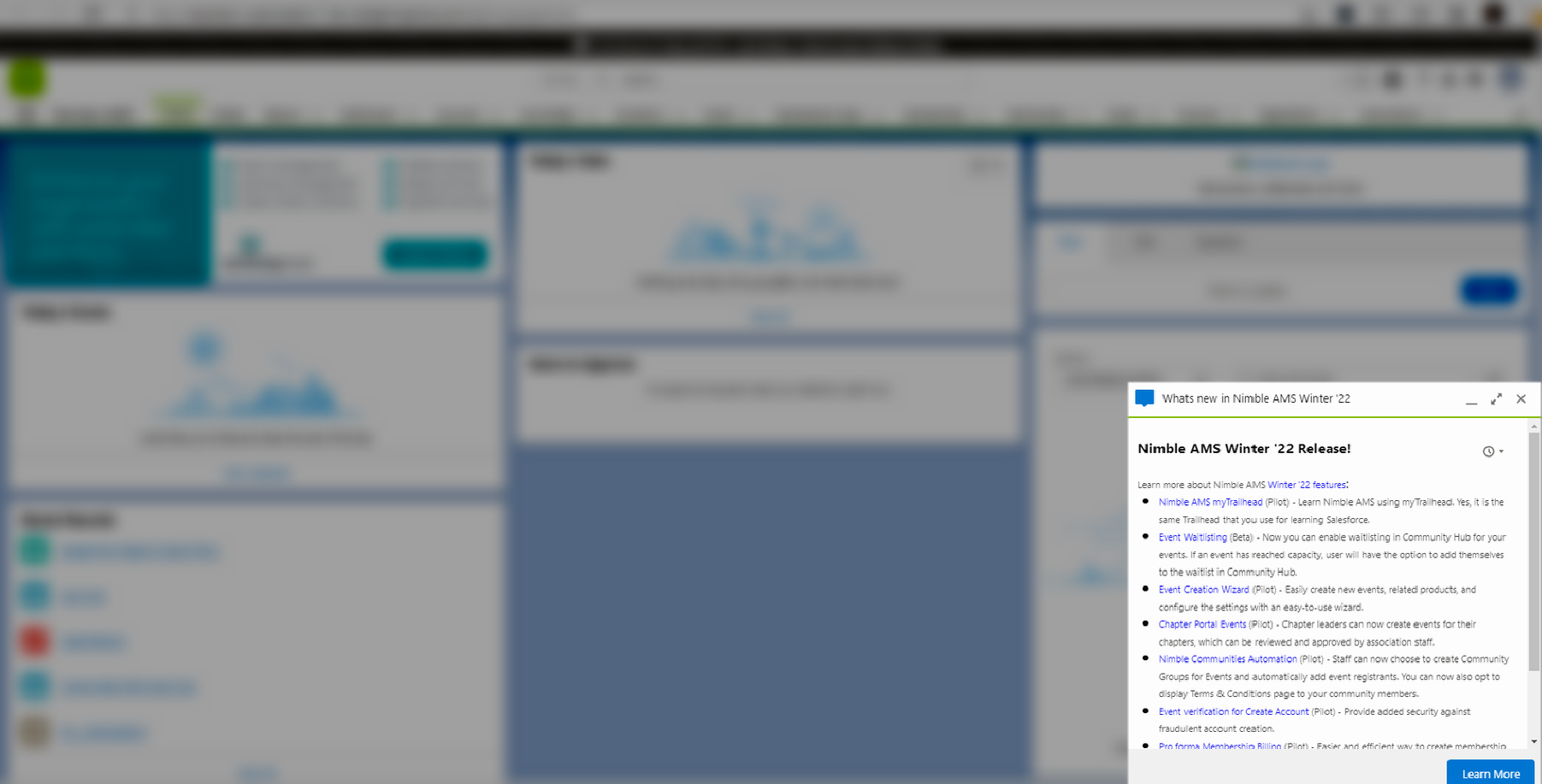 Stay up to date on Nimble AMS releases and take advantage of new features that will benefit your business. Introducing Nimble AMS In-app Prompts! By leveraging the capability of the Salesforce platform feature, In-App Guidance (External), Nimble AMS will alert you of new releases and capabilities to help you navigate through our software improvements with greater ease and satisfaction.