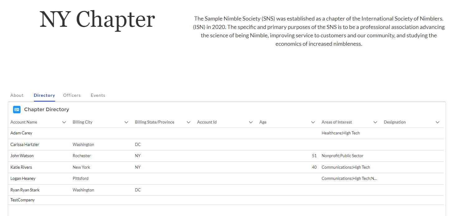 The Chapter Directory Lightning Web Component (LWC) is a component that displays a list of members of the specifed chapter. It can be configured to use a specific chapter ID, or to display dynamically based on a URL parameter.