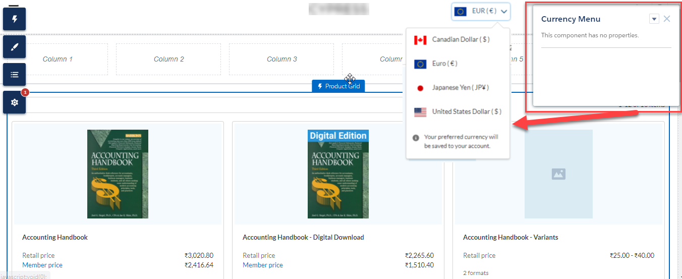 On the page, click within the Currency Menu component to bring up the Property editor. There are no properties available for this component.