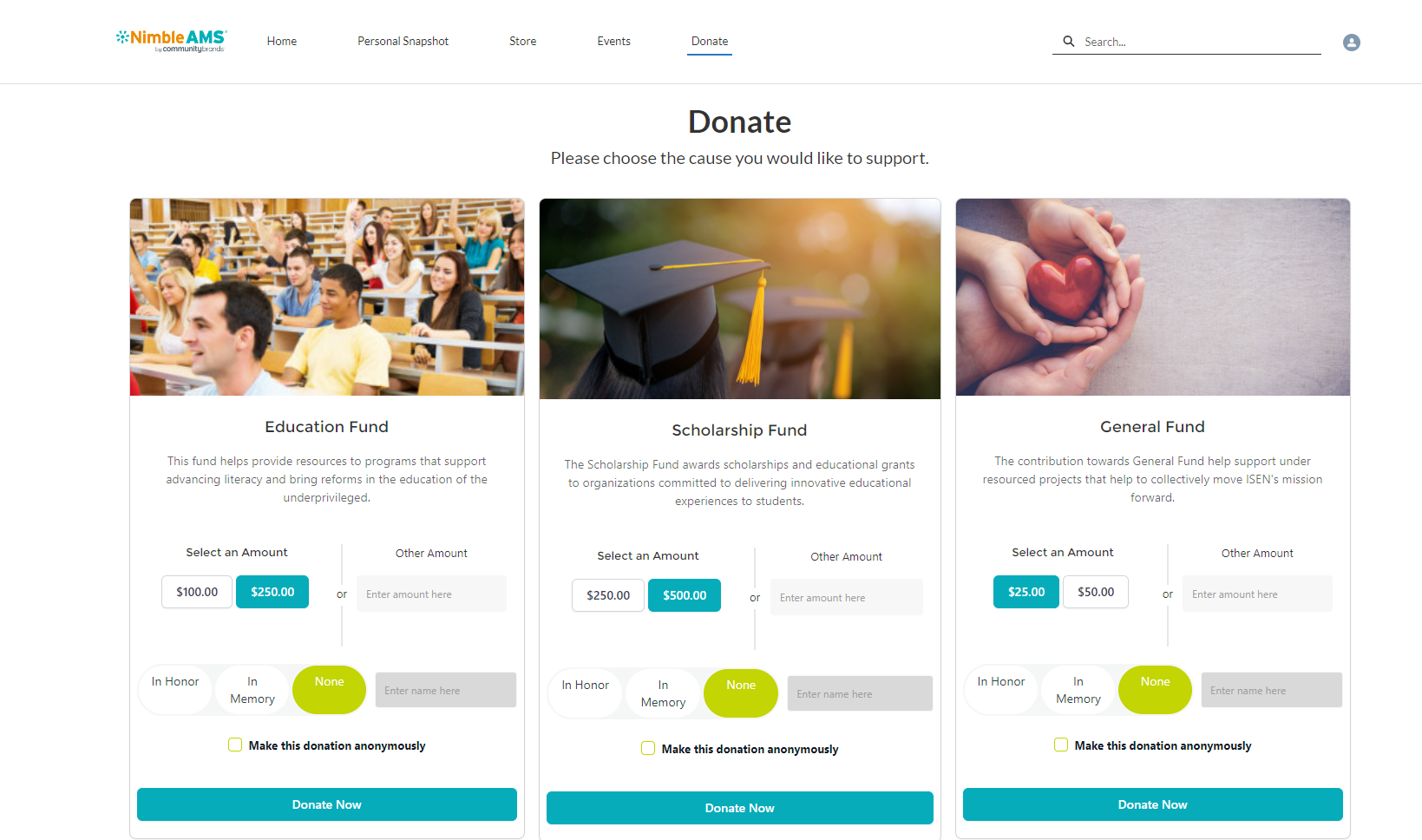 The Donations Lightning Web Component (LWC) in Experience Builder is purpose-built to enable association constituents to make a one-time donation to support the association’s cause. They also have the option to dedicate their contribution ‘in honor of’ or ‘in memory of’ someone.