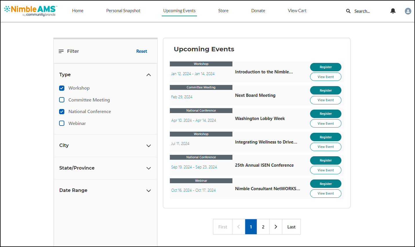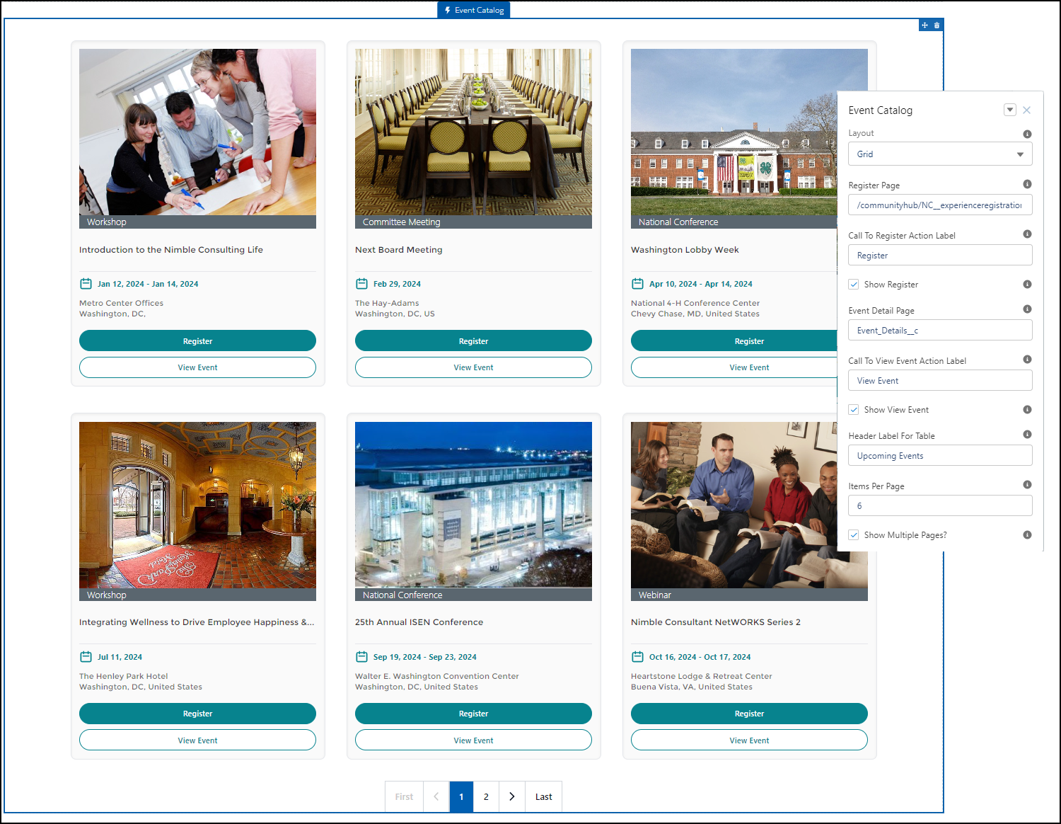 Event Catalog Lightning Web Component (LWC) enables your association to showcase its upcoming events on the Experience Cloud Lightning pages that are visually appealing and modern. App Builders can choose Grid, Table, or Compact layout based on how associations want to display their events to their constituents.