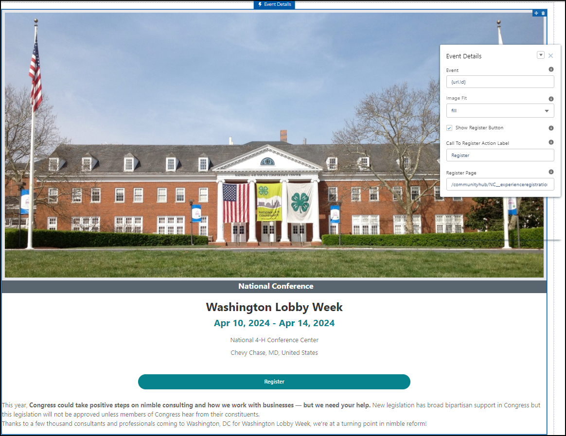 The Event Details Lightning Web Component (LWC) displays the detailed information of a particular event along with the Event Type, Event Image, Event Name, Start & End Date, and other related important details. This component can be placed on the Experience Cloud Lightning Page and provide the constituents with modern looking user experience.