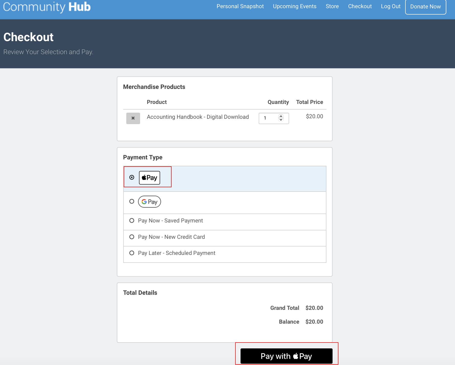 Let's say there is a member who wants to buy the Accounting Handbook - Digital Download from the online store. The Buy Now button will take them straight to the Experience Cloud Checkout page where they can view their order details and pay through the Apple Pay option. After successfully completing the purchase process, a detailed Order summary page will be displayed.
