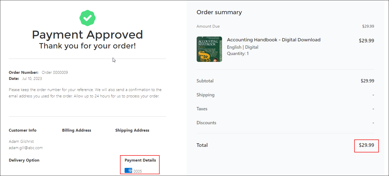 Upon completion of the purchase process, order will be created, and an Order Summary page will be generated.