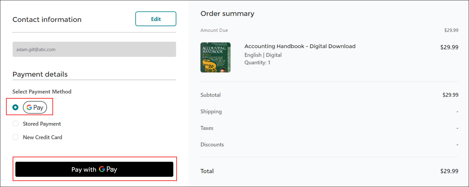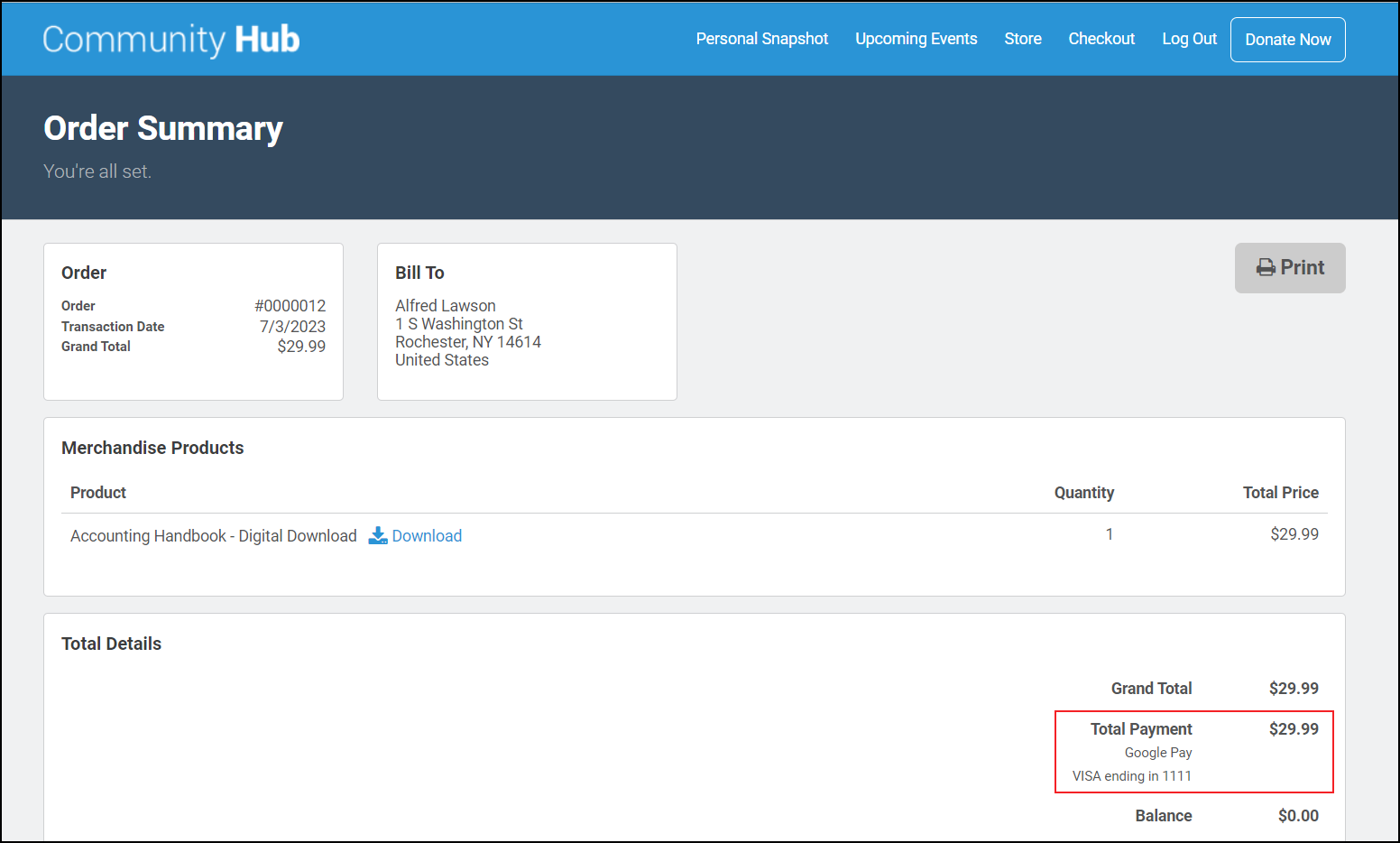 Let's say there is a member who wants to buy the Accounting Handbook - Digital Download from the online store. The Buy Now button will take them straight to the Member Portal Checkout page where they can view their order details and pay through the Google Pay option. After successfully completing the purchase process, a detailed Order summary page will be displayed.