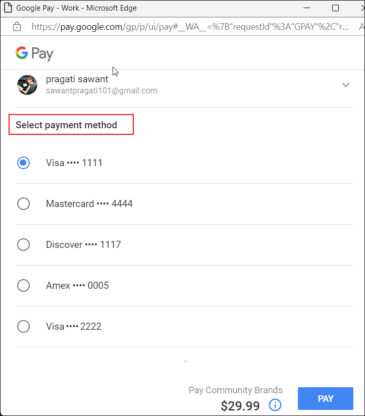 Figure 2. The screenshot shows the Google Payment Sheet with the already saved payment details.