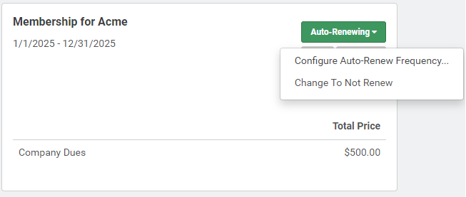 - Auto-Renewing of Company Membership: Company Managers can enable or disable automatic renewal for the company membership using his stored payment method. They can select the Change to Not Renew from the Auto-Renewing drop-down for one time membership or select the Configure Auto-Renew Frequency to renew the membership at a predefined frequency. They can then select the payment method from a list of company manager's stored payment methods to pay for the auto-renewable membership. Also, if a selected donation type has the donation frequency feature enabled, they can keep donation as one time or configure the donation frequency.