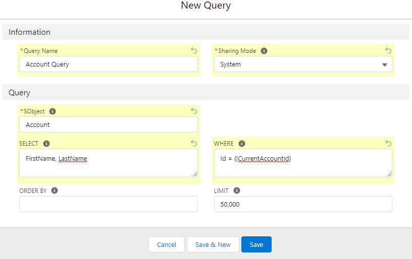 This query (See: creating a query) will return the current Account that clicks the button. The resulting record(s) from this query will be used as an input variable for our flow.