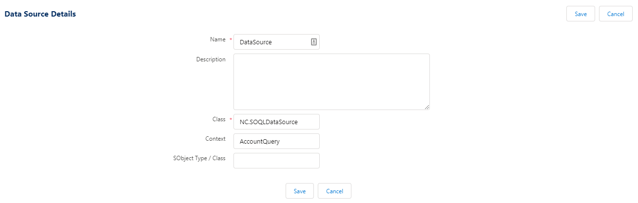 NC.SOQLDataSource. - In Context, enter the Query Name of the query created before.