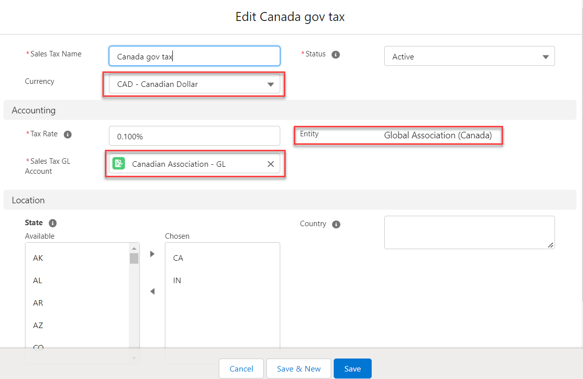 While creating a new Sales Tax record make sure to select the Currency field value that matches the Currency field value on the linked Entity and Sales taxrecord. If the Currency field value of the Entity and Sales tax recorddoes not match, then it throws an error.