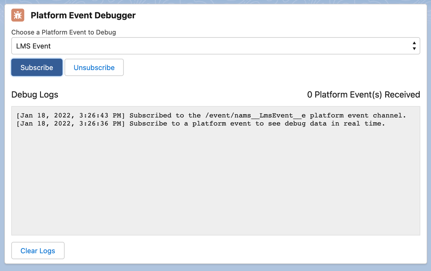 From here you can use the Platform Event Debugger by selecting LMS Event option from the dropdown and clicking Subscribe.