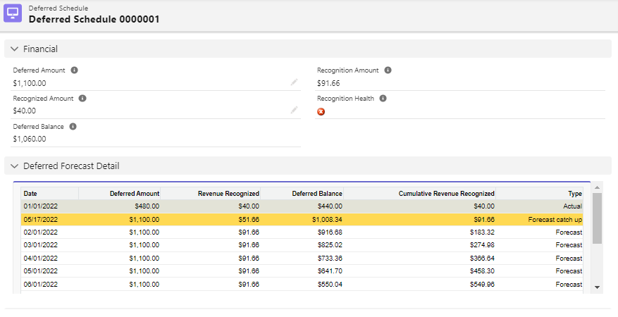 Previously there was no column for forecast type in deferred schedule. If membership was cancelled by mid-year, then it did not recognize the revenue for the rest of the duration. To resolve this issue, we have added the Type column with fields which are Actual, Forecast Catchup and Forecast. If there is Forecast Catchup row then it will be highlighted. In terms of transactions, it provides the appropriate deferred revenue forecast. (AMS-12595)