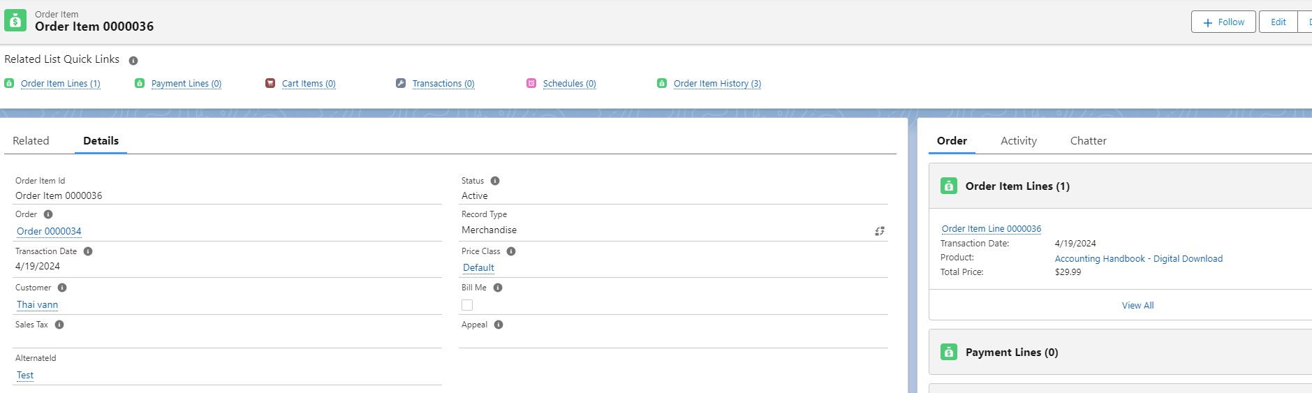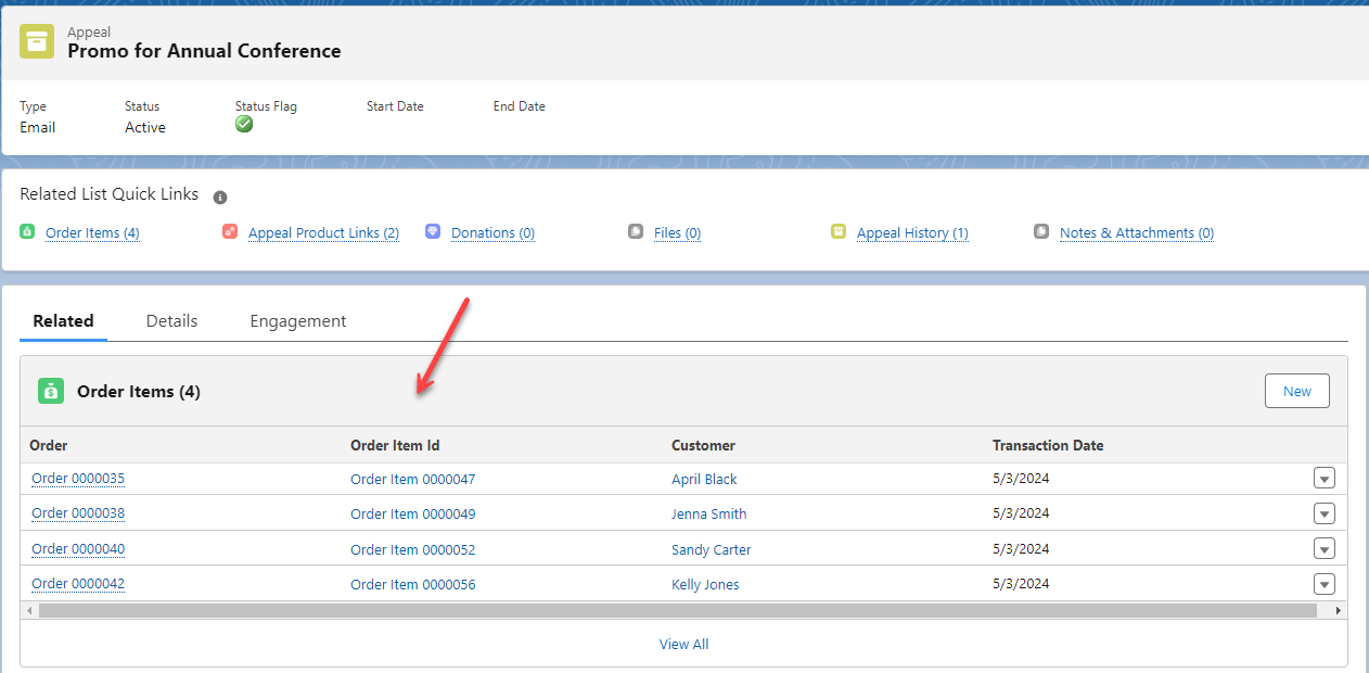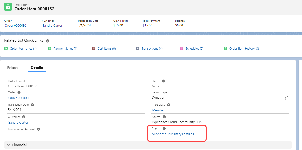 Figure 1 - The Order Item record’s Appeal lookup field is populated when the marketing campaign effort is done through the Appeals object