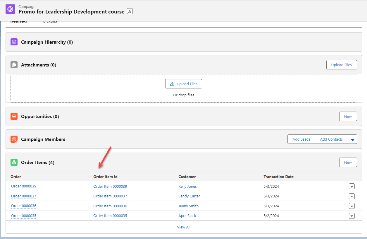Figure 2 - A Custom field in the Order Item record is populated when the marketing campaign is tracked through Salesforce’s Campaign Object or a 3rd party marketing tool.