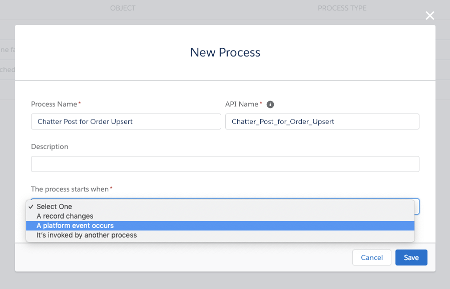 Process Name. ForThe process starts when, selectA platform event occurs.Click the Add Trigger box, and set up the trigger as follows: