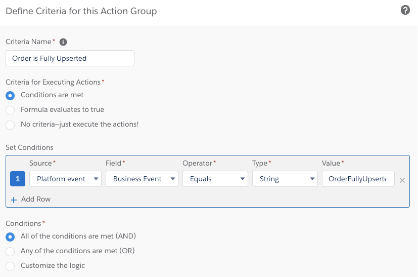 Set Conditions:Field Value SourcePlatform eventFieldBusiness EventOperatorEqualsTypeStringValueOrderFullyUpserted(This value depends on the business event you want to use as the trigger. Be sure to enter the business event's API Name, not its label. The API Name can be found in the table at the top of this page. For custom business events, the API Name can be found in Setup | Custom Metadata Types | Manage Records for Business Events).- For