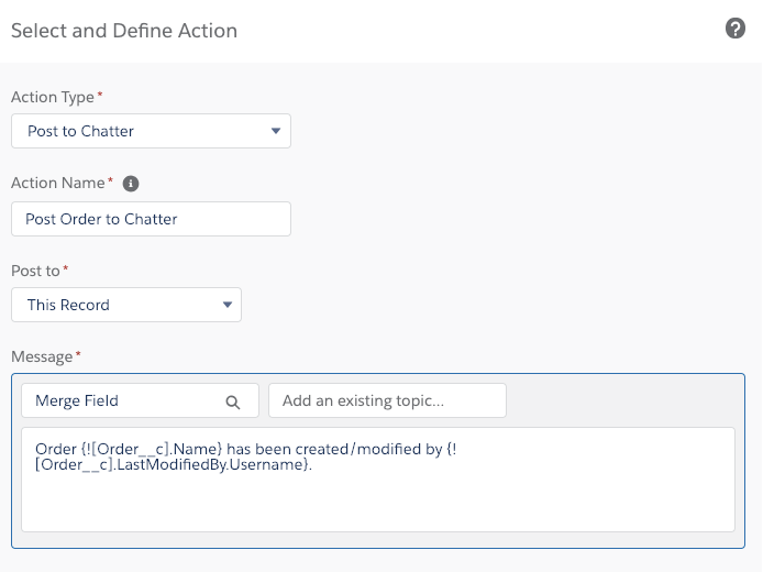 - Lastly, create actions, which can reference the order that fired the business event. For example, let's post to Chatter and reference the order name. Under Immediate Actions, click Add Action: