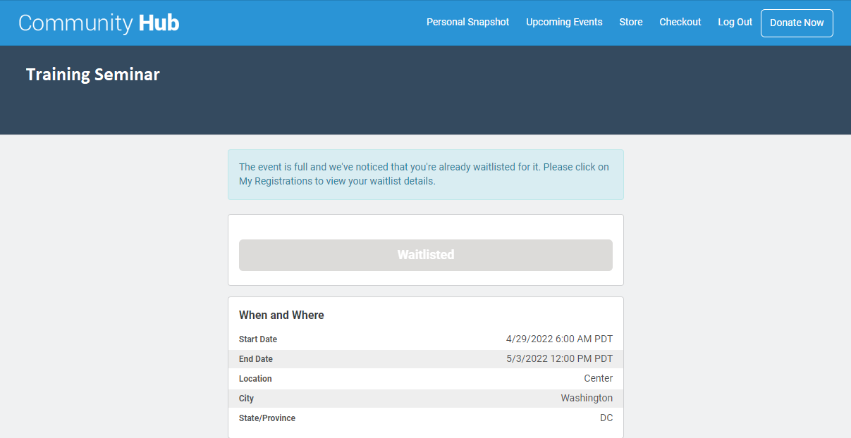 - The event must have already reached its full capacity or the association staff has manually activated the waitlisting for the Community Hub portal.