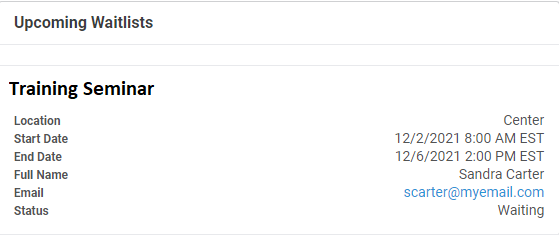 The member is then taken to their My Registrations page. Depending on your Association's business process, the member may receive an email notification confirming their waitlist status. Members can visit the My Registrations page at any time to get updates on their waitlist status.