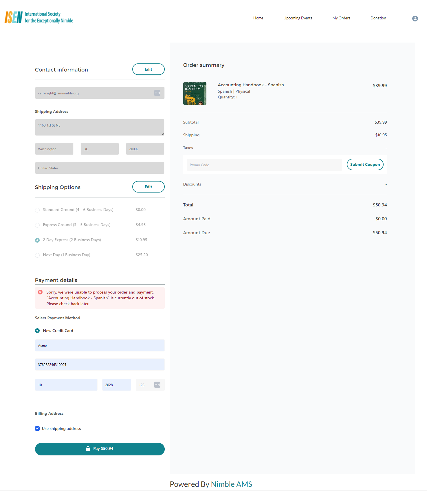 If the inventory happens to go out of stock while the member is in the process of checking out, then they will see a message that reads, "Sorry, we were unable to process your order and payment. “<Product name>” is currently out of stock. Please check back later" (as shown in figure 9). This will prevent them from being able to proceed and their method of payment will not be charged.
