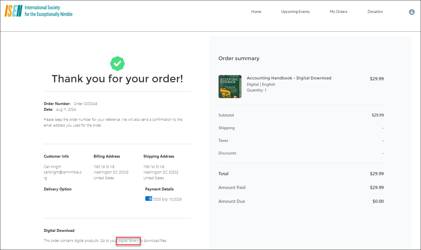 Member Portal allows a constituent to purchase a downloadable product and then download it through an easy-to-use product downloads page. Purchasing a downloadable product is similar to any merchandise product. On the Payment confirmation page, if the order contains a downloadable product, a link is provided to go to the Digital Library page to download the content. See Figure 11.