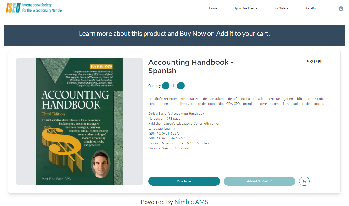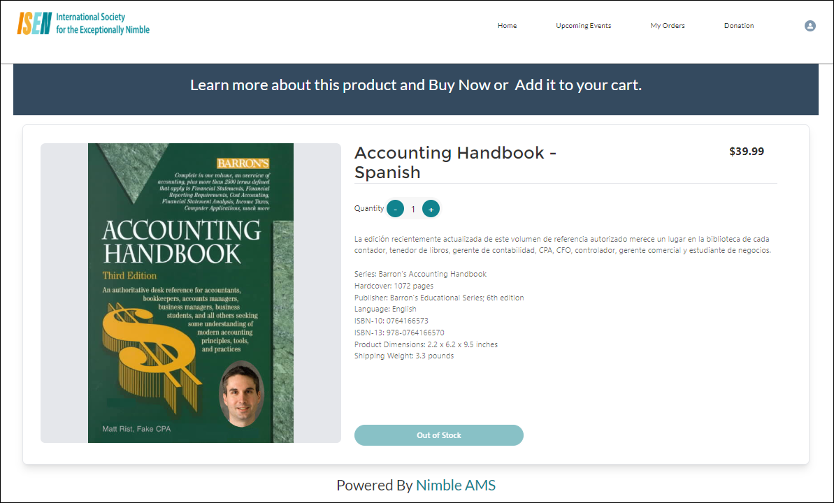 Association members can browse through the various merchandise products (including downloadable products) available for purchase through the association's online store. They can view additional product information by clicking on any of the merchandise products in the store. For each merchandise product, they see the image, name, description, and price of the product. The product's list price is displayed to the guest user. A special price, when applicable, is displayed when a user logs into Member Portal. They will also be able to choose the quantity that they want to purchase.