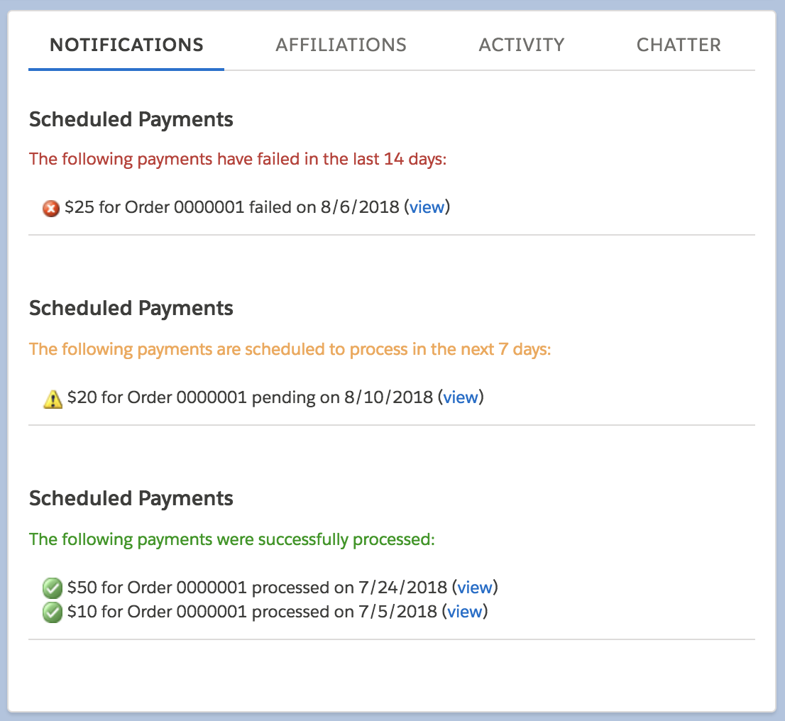 You can always go to the Schedules tab to view schedules and the child schedule lines but it can also be helpful to view schedule lines directly from a constituent's account record. We provide a couple of ways to view this info. If a scheduled payment fails, an error message will now be captured in the Status Detail field on the corresponding Schedule Line making it easier to diagnose problems.