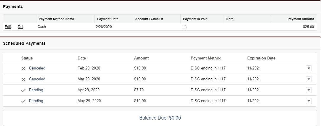 As an example, if there is an order with a total amount of $43.6 and it is scheduled with 4 installments of amount $10.90 each, then 4 schedule lines get created. If the staff user pays off $25 on the constituent's behalf, then the first two schedule lines get canceled and the third schedule line's amount gets adjusted to $7.70.